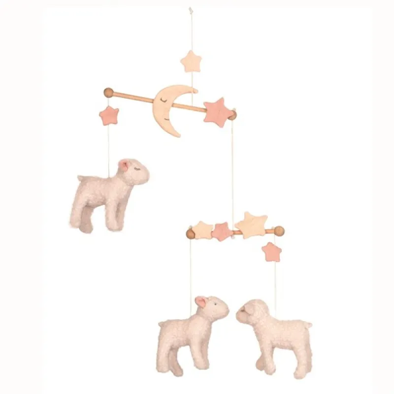 Cu fiecare adiere de vânt sau mică mișcare, mielușeii prind viață și dansează veseli în jurul copilului, creând un decor plin de farmec și bucurie.