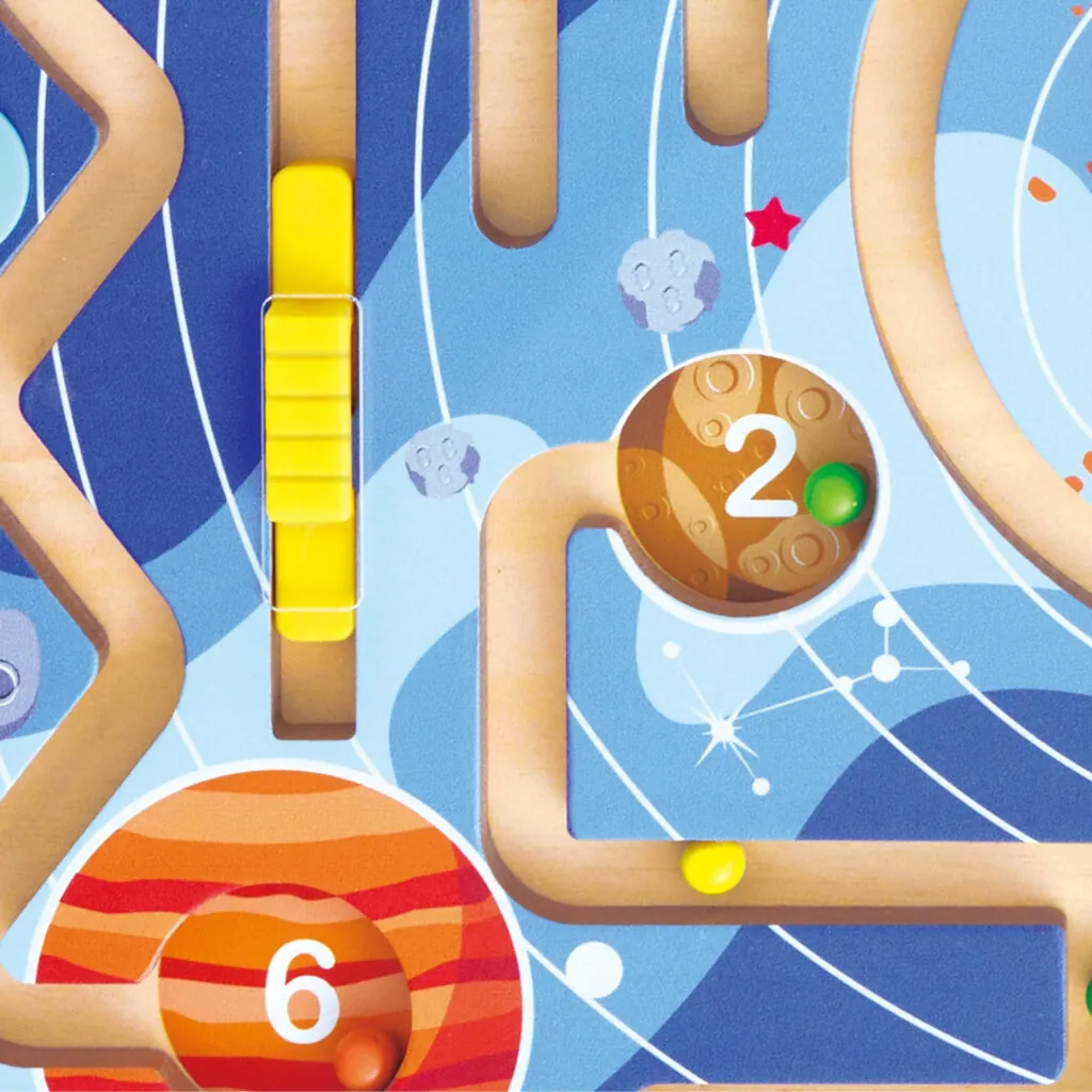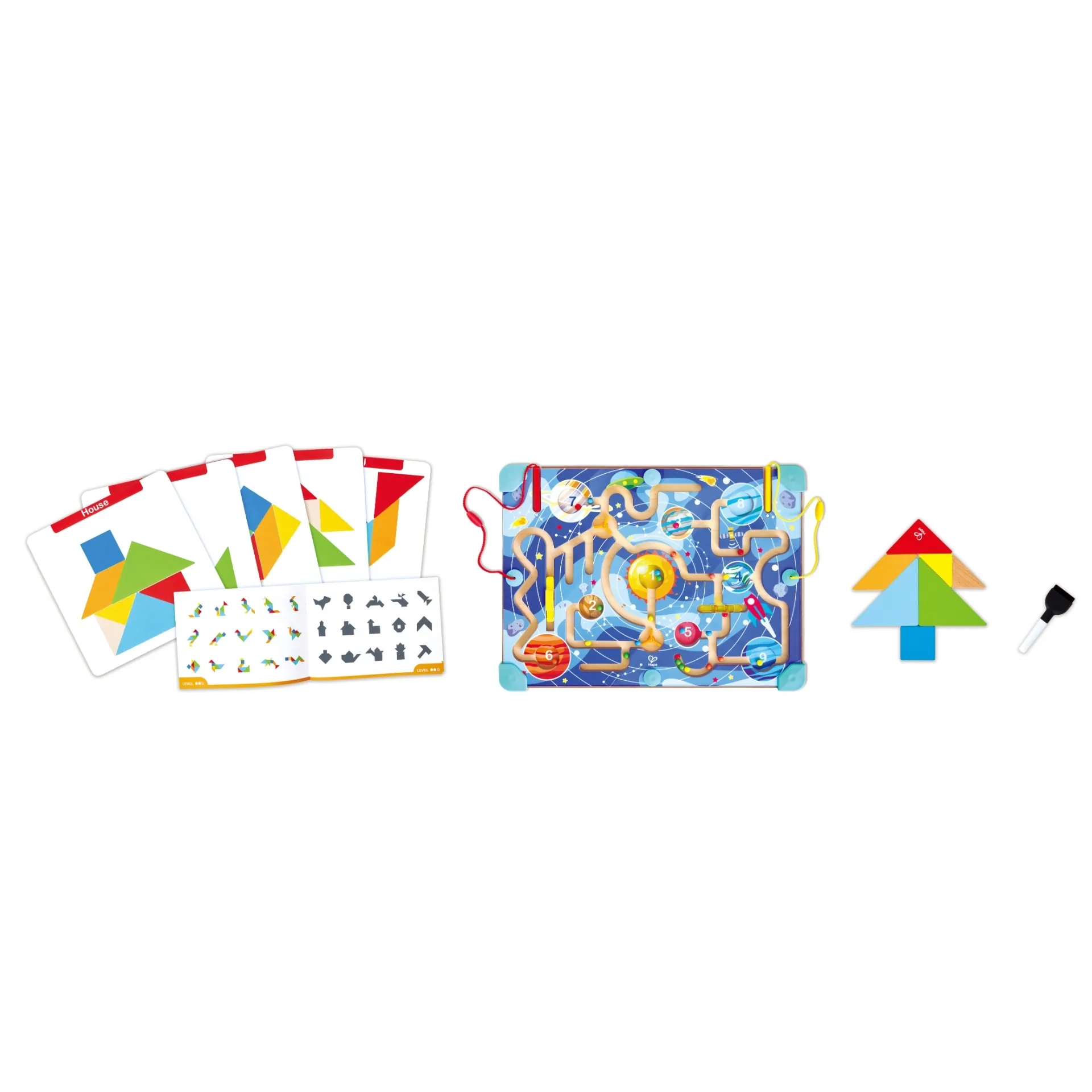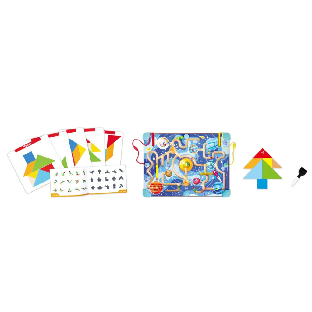 Aceasta jucarie este un adevarat schimbator de jocuri cu designul sau cu doua functii. O parte este un labirint magnetic cu o aventura cu tematica spatiala care ii permite copiilor sa exploreze cosmosul. Cealalta parte este o tabla alba asociata cu tangram!