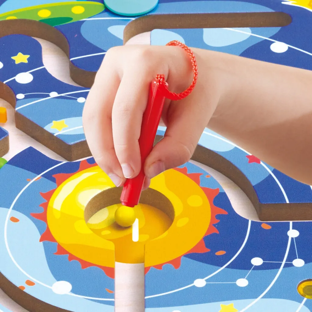 Cu urmele sale complicate si margelele colorate, copiii pot folosi stiloul magnetic pentru a muta margelele si chiar pentru a aprinde bilele de otel in labirintul plin de elemente spatiale.