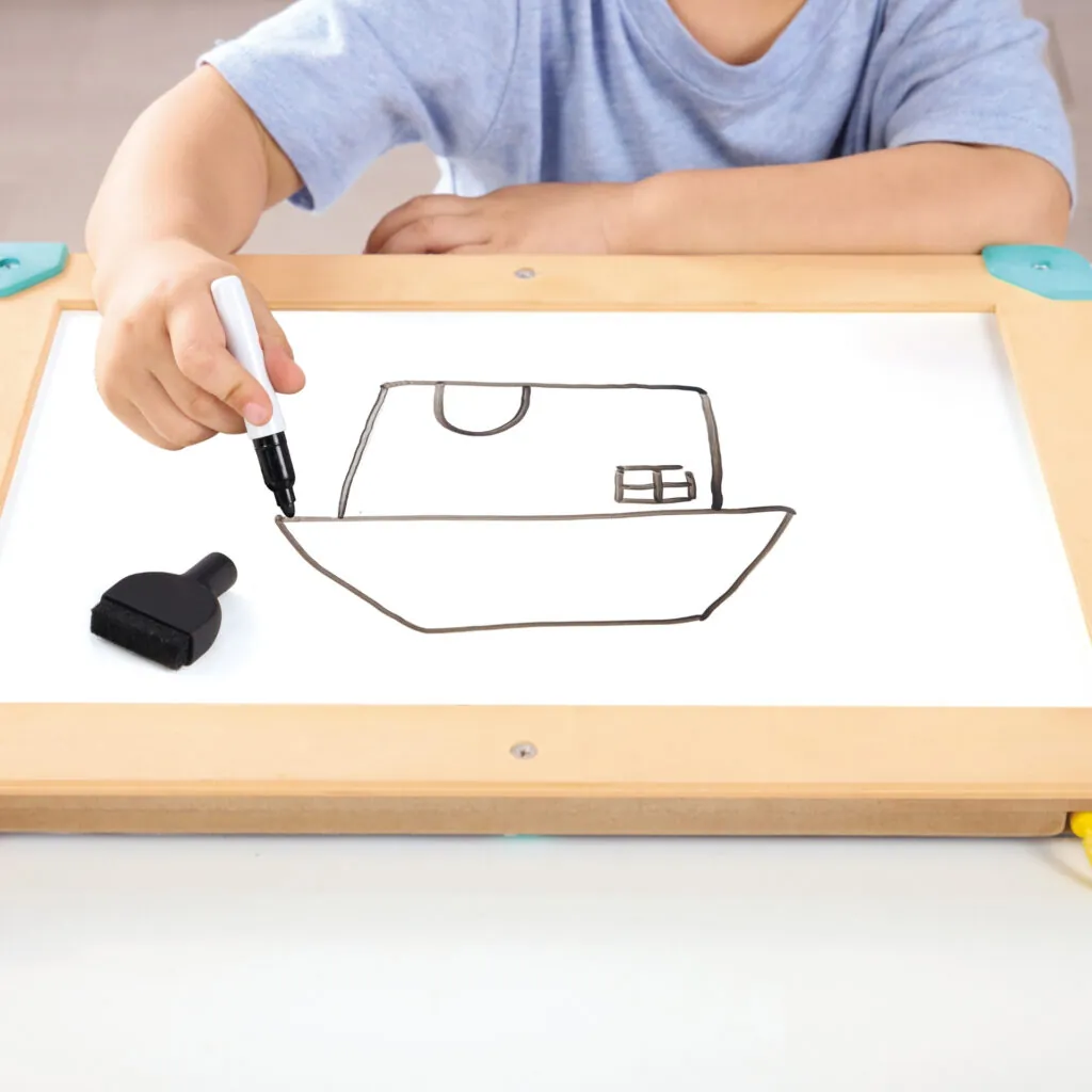 Intoarceti tabla pentru a dezvalui o tabla alba in care copiii pot desena, mazgali si pot rezolva probleme, sporindu-si imaginatia si abilitatile motorii fine.