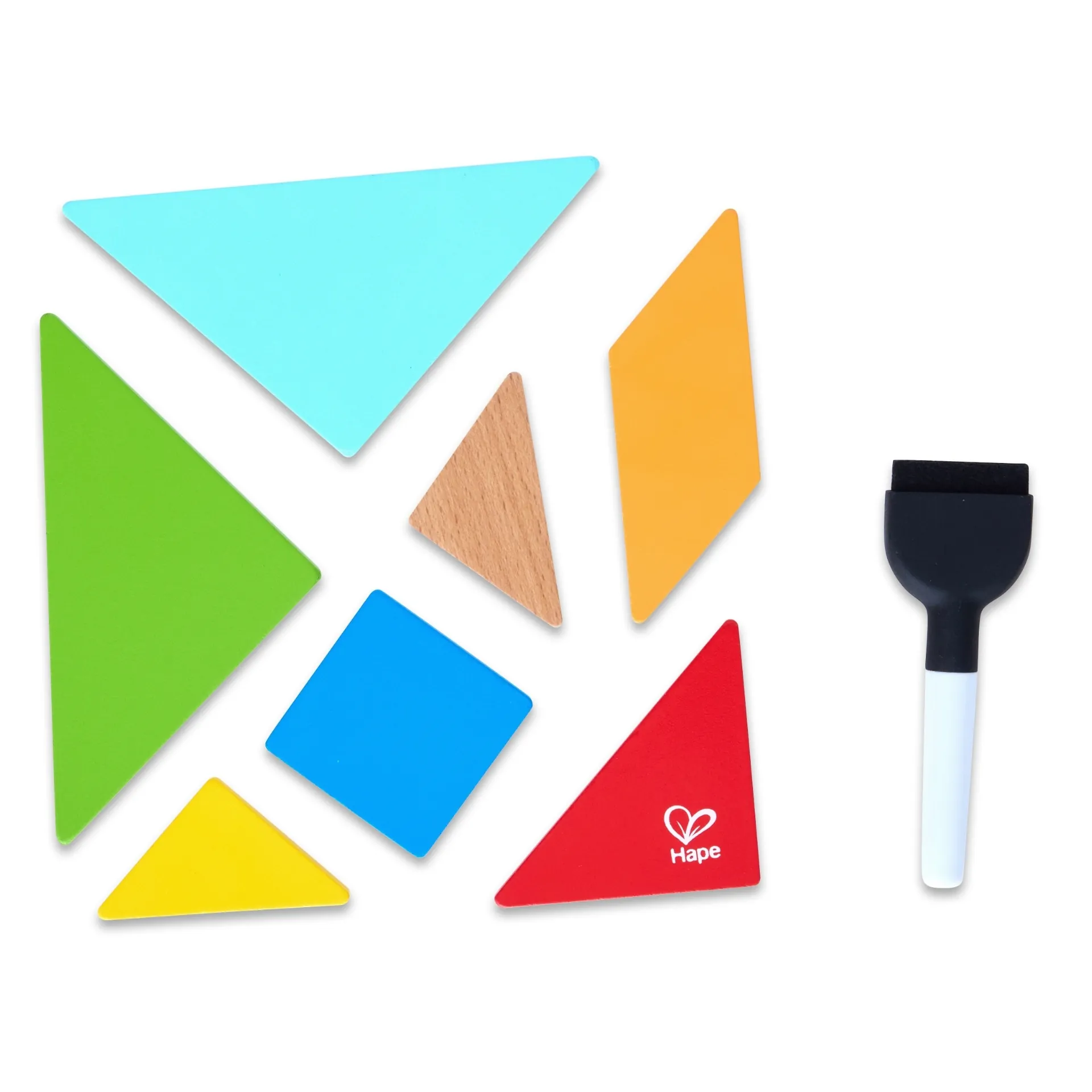 Exista un manual de joc tangram si un manual plin cu 150 de transformari. Caietul de joc ofera provocari cu modele negre si raspunsuri colorate, ajutand copiii sa invete forme si sa dezvolte imaginatia spatiala.