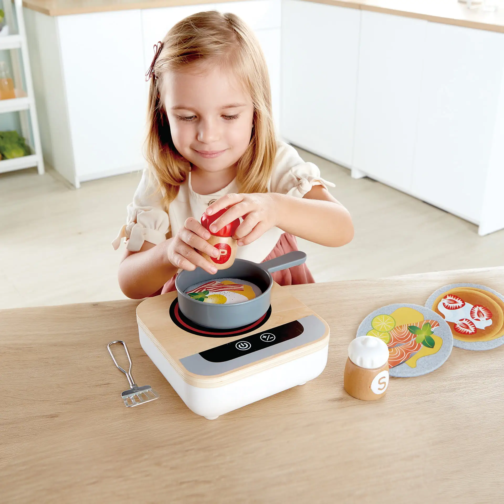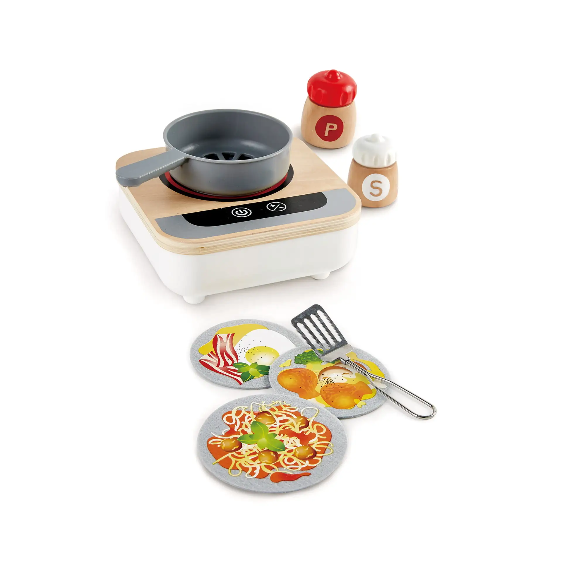Setul de jucarii din lemn are elemente precum ventilatorul incorporat, care face ca mancarea sa se intoarca in tigaie, sare si piper care se rotesc si se invart atunci cand presarati in tigaie.