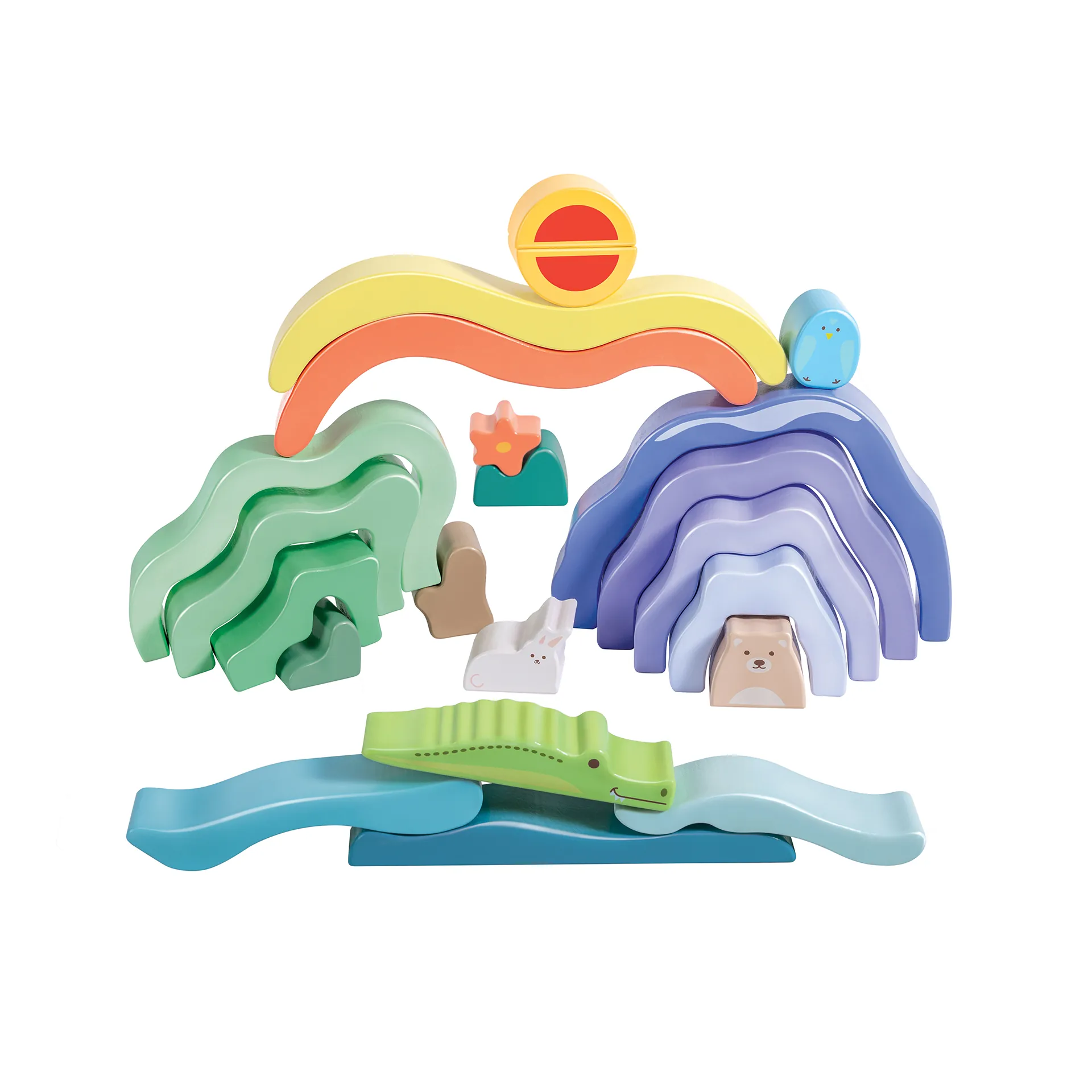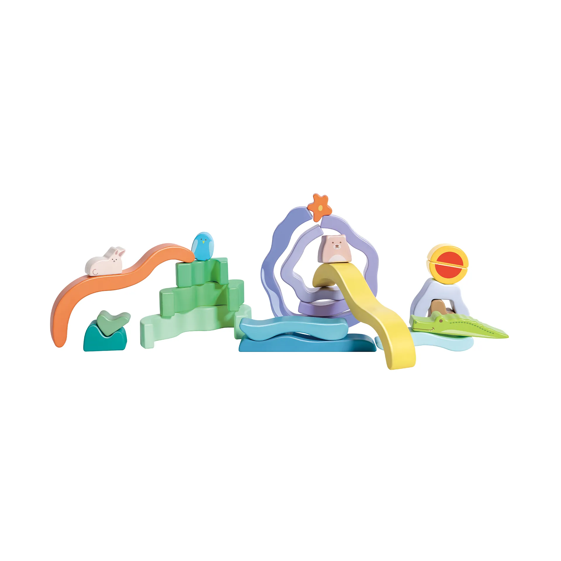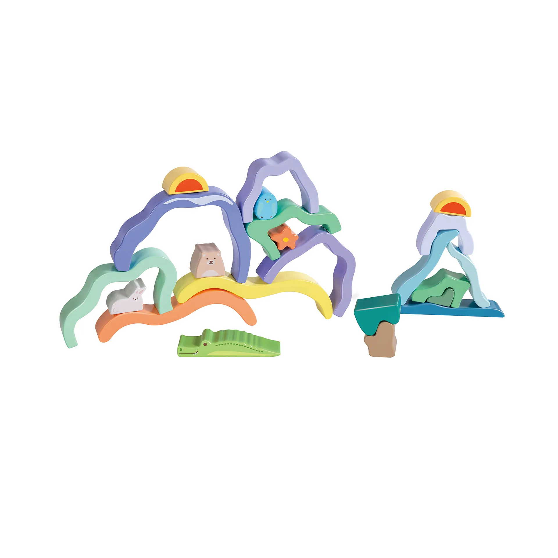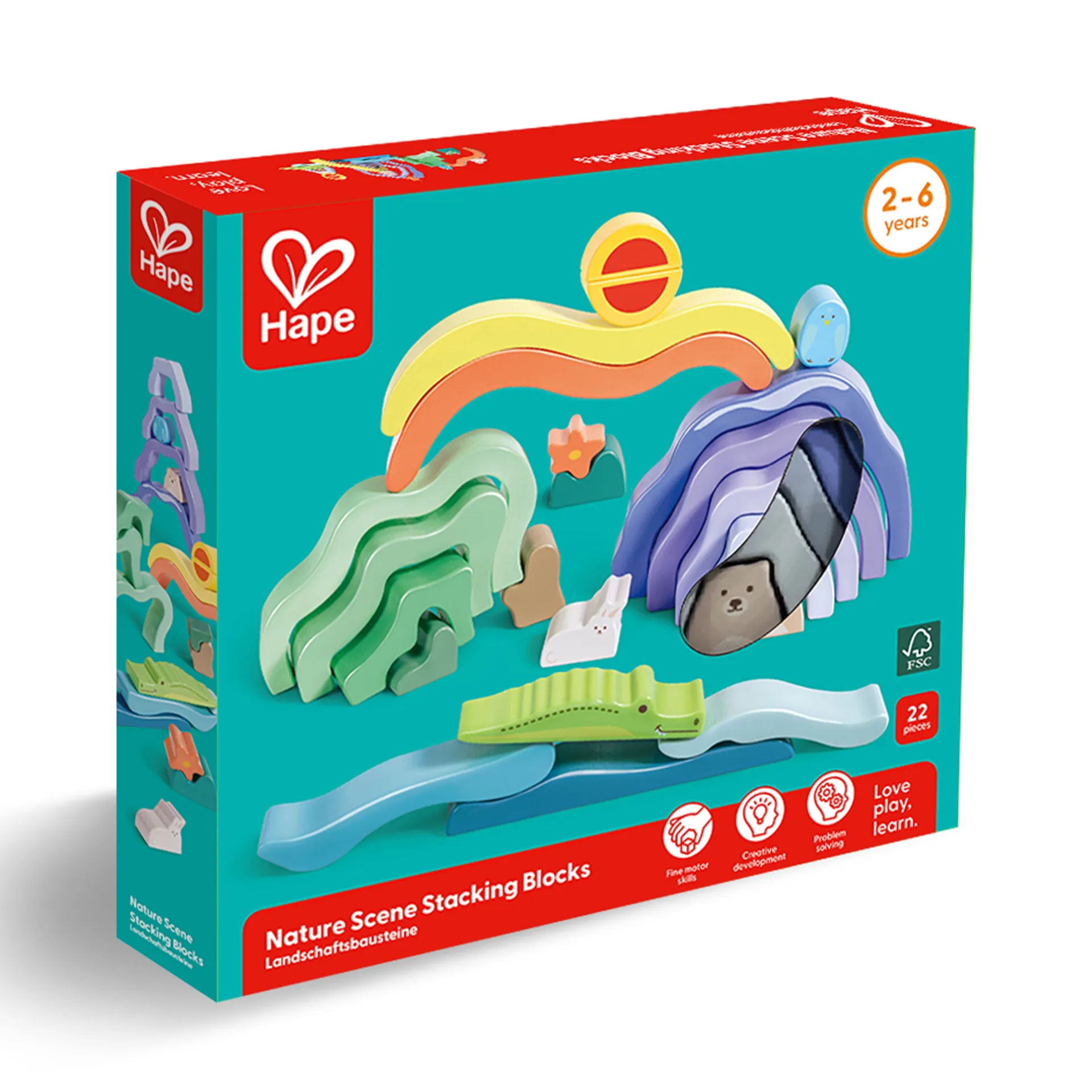 Acest set de blocuri contine 22 de piese colorate care includ copaci si munti pitoresti si chiar personaje animale precum un urs, iepuras si crocodil.
