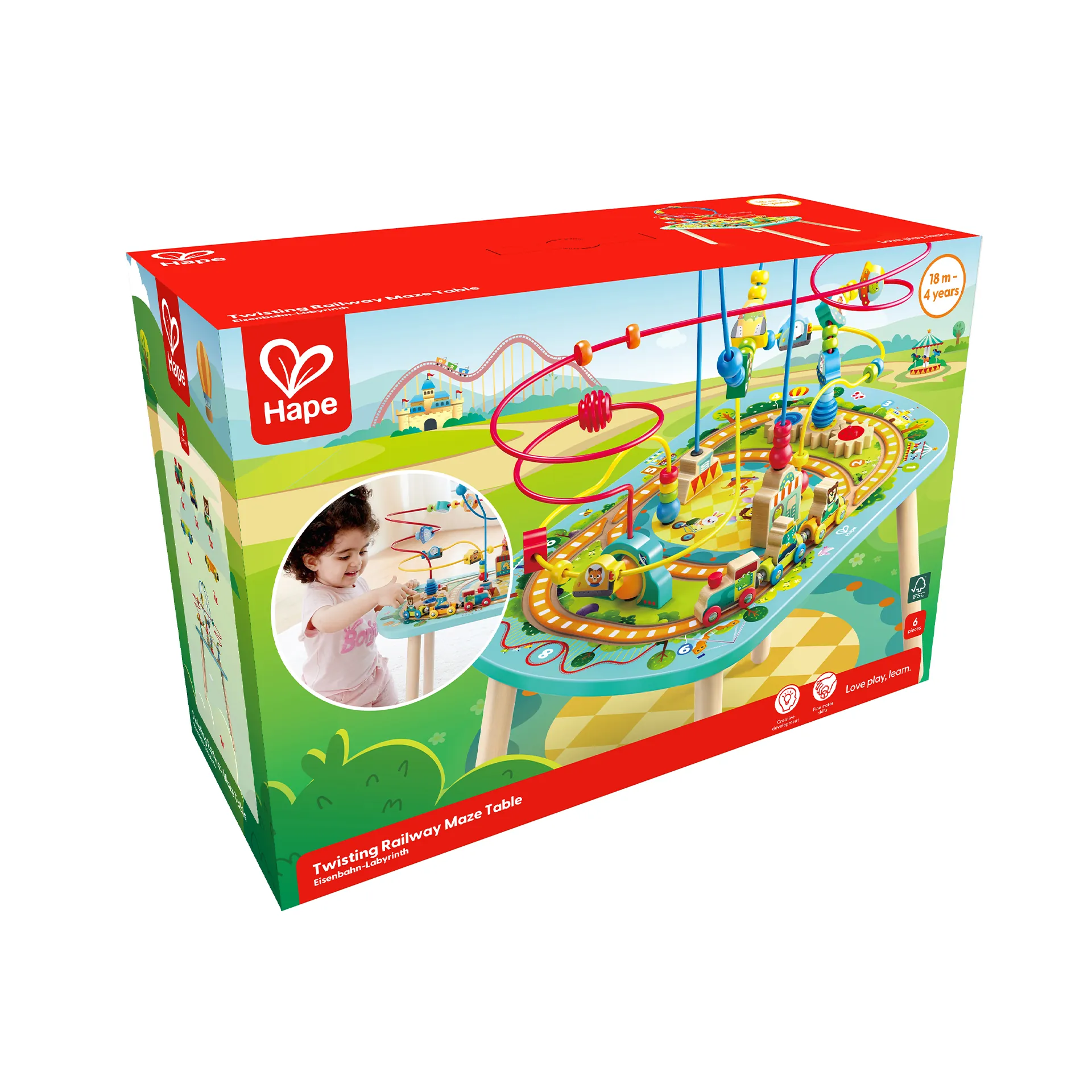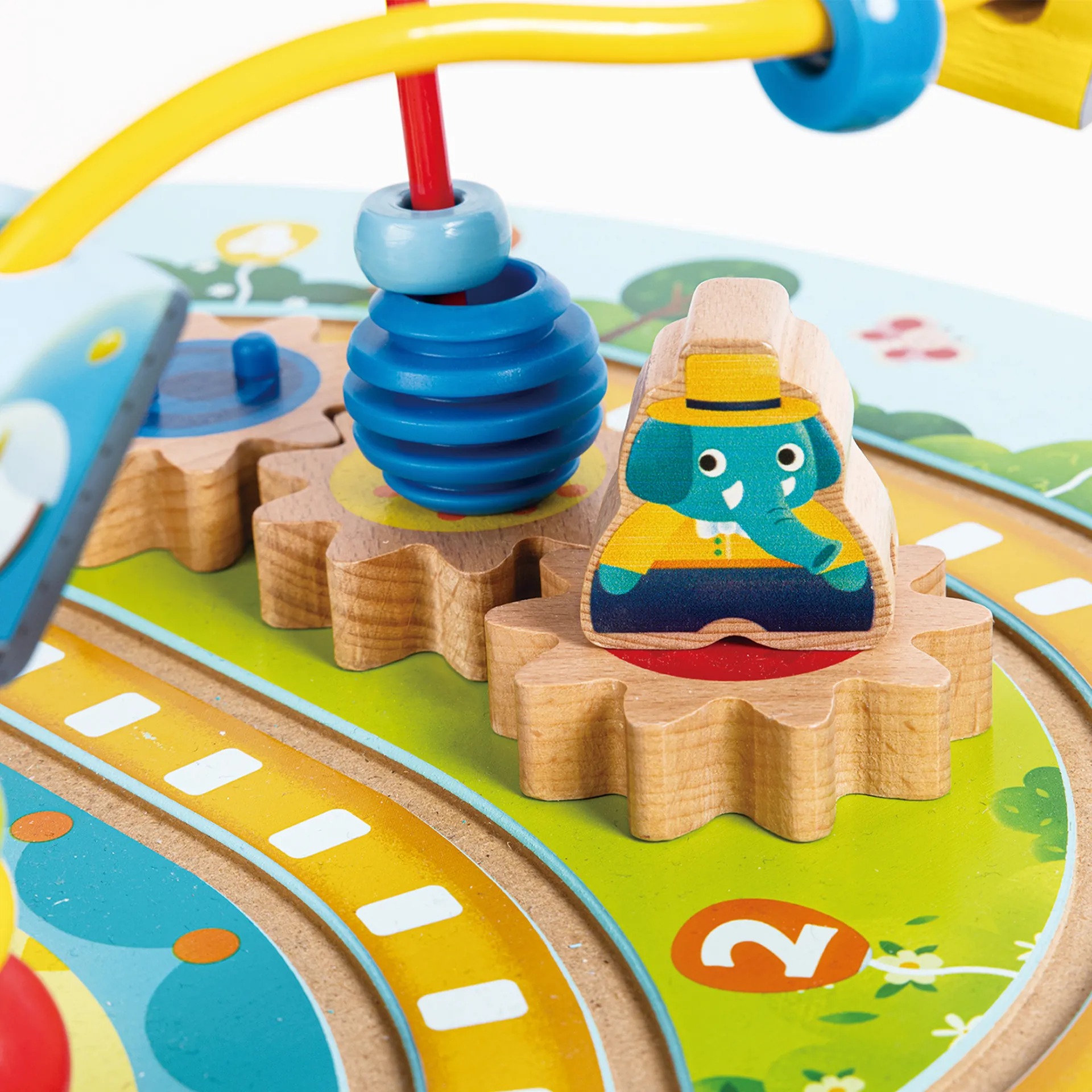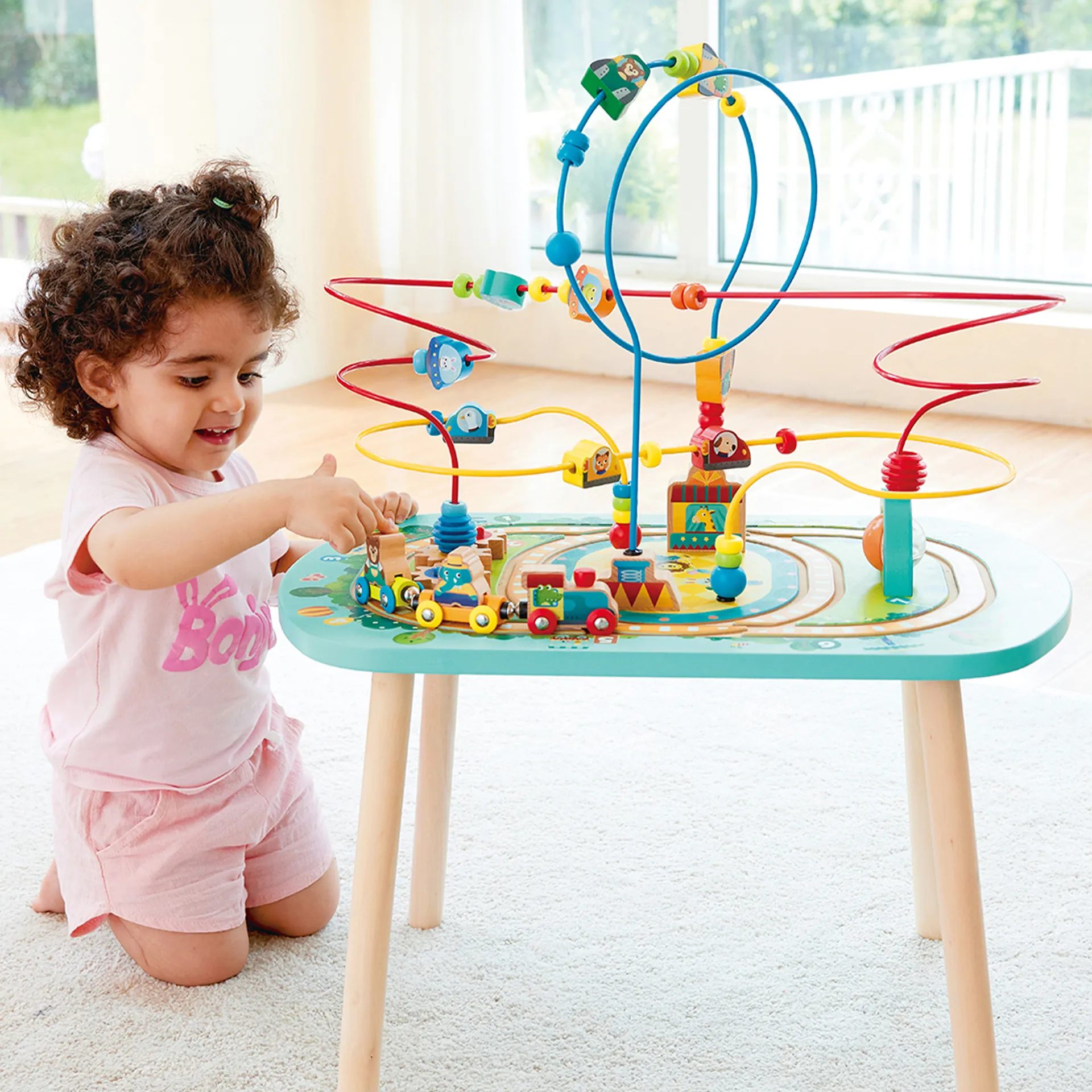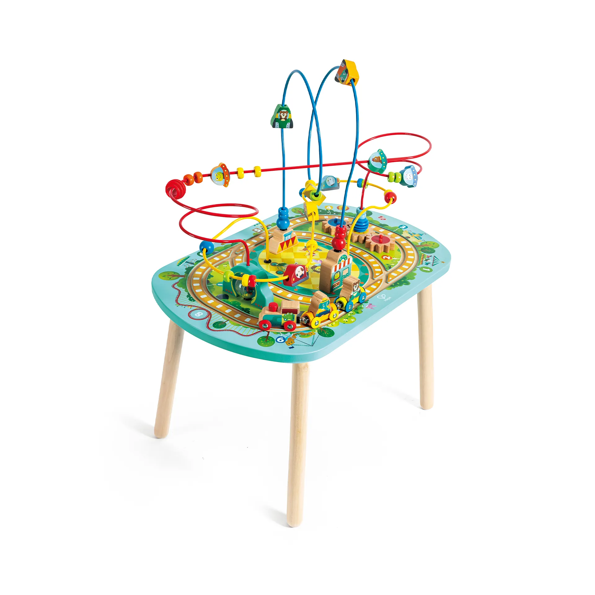 Jucarie din lemn – Masa cu cale ferata, parc de distractii. Culorile stralucitoare, formele groase, grafica animalelor si efectele sonore, sprijina copiii in dezvoltarea lor senzoriala.