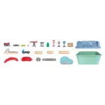 Include 1 cutie cu 1 capac, 1 bloc, 3 sine de plastic in forma de S, 6 sine drepte de patru inchi, 1 sina dreapta de 6 inchi, 8 sine curbate mici, 1 sina ascendenta, 4 conuri de trafic, 3 pini, 1 card ocean, 1 pod rosu, 1 tren locomotor electric, 1 tren locomotor cu 2 vagoane, 1 camion, 1 vagoana, 1 camion, 2 vagoane macara, , 2 piste montane din plastic, 6 chei, 1 semn de circulatie triunghi, 1 semn de circulatie cerc.