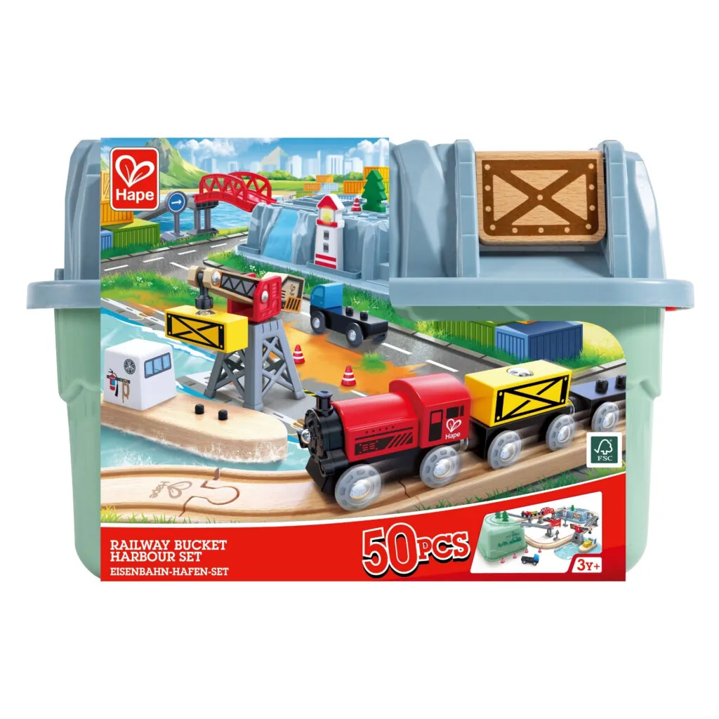 Include 1 cutie cu 1 capac, 1 bloc, 3 sine de plastic in forma de S, 6 sine drepte de patru inchi, 1 sina dreapta de 6 inchi, 8 sine curbate mici, 1 sina ascendenta, 4 conuri de trafic, 3 pini, 1 card ocean, 1 pod rosu, 1 tren locomotor electric, 1 tren locomotor cu 2 vagoane, 1 camion, 1 vagoana, 1 camion, 2 vagoane macara, , 2 piste montane din plastic, 6 chei, 1 semn de circulatie triunghi, 1 semn de circulatie cerc.