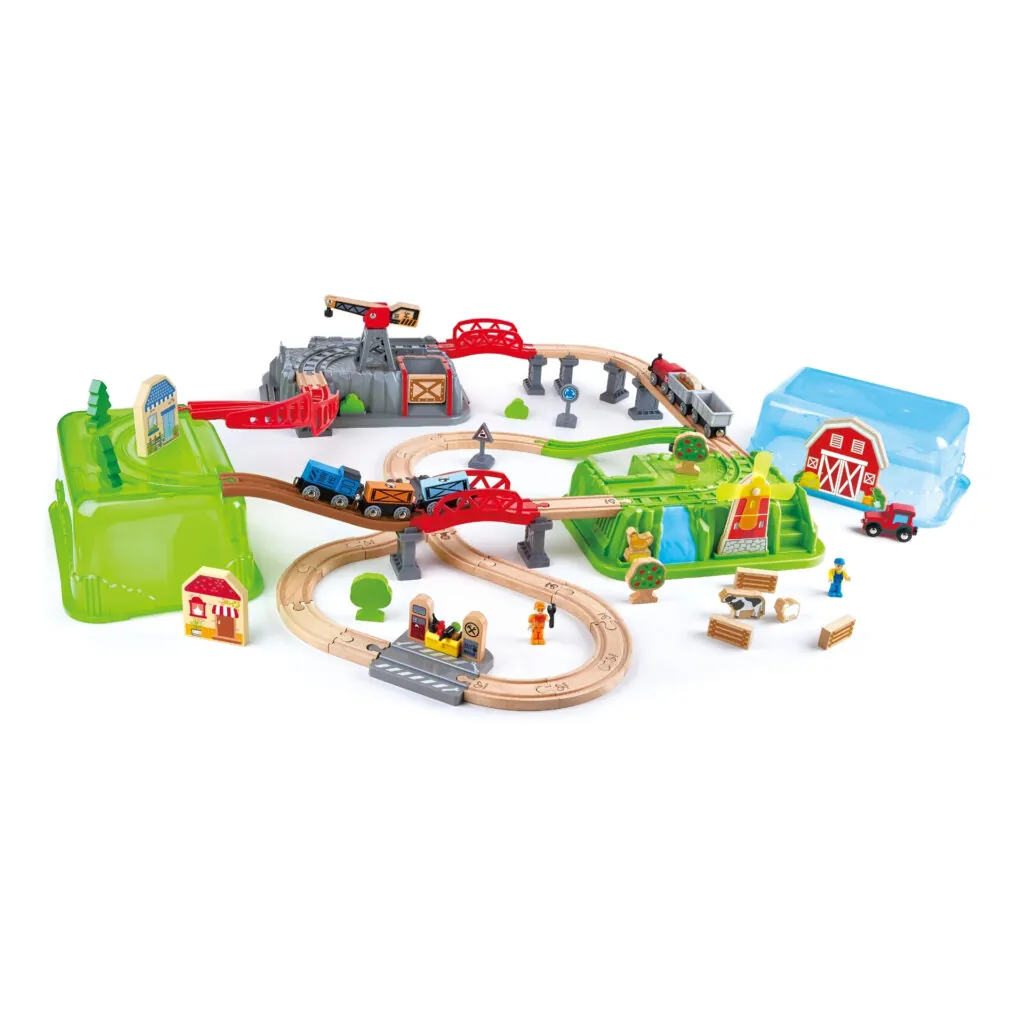 Contine o multime de accesorii care sa te ajute sa fii creativ si sa inventezi povesti. Setul include o cutie cu capac, doua sine de plastic in forma de S, zece sine mici curbate, trei sine drepte, doi copaci, o gaina cu cuib, o vaca, o oaie, trei garduri, o cutie de mere, un cap de camion, o locomotiva cu doua masini, o cabana, un pod, o moara de vant, sapte sine de plastic si un pod. Excelent pentru a hrani creativitatea si imaginatia. Util pentru a invata despre agricultura si munca grea! Ajuta copiii sa invete sa colecteze, sa organizeze si sa rezolve lucrurile in mod independent.