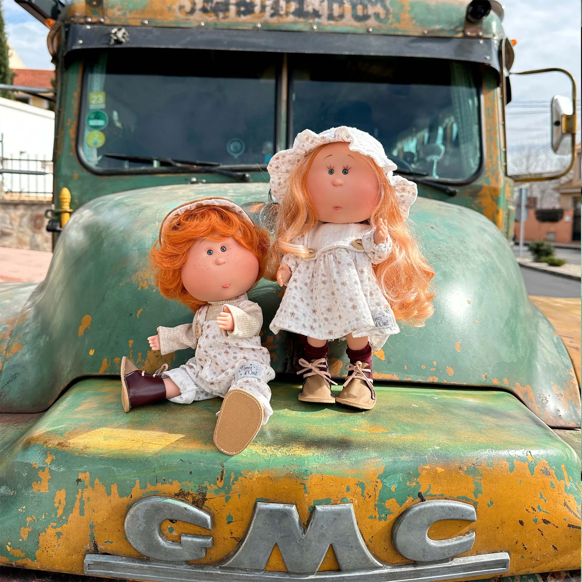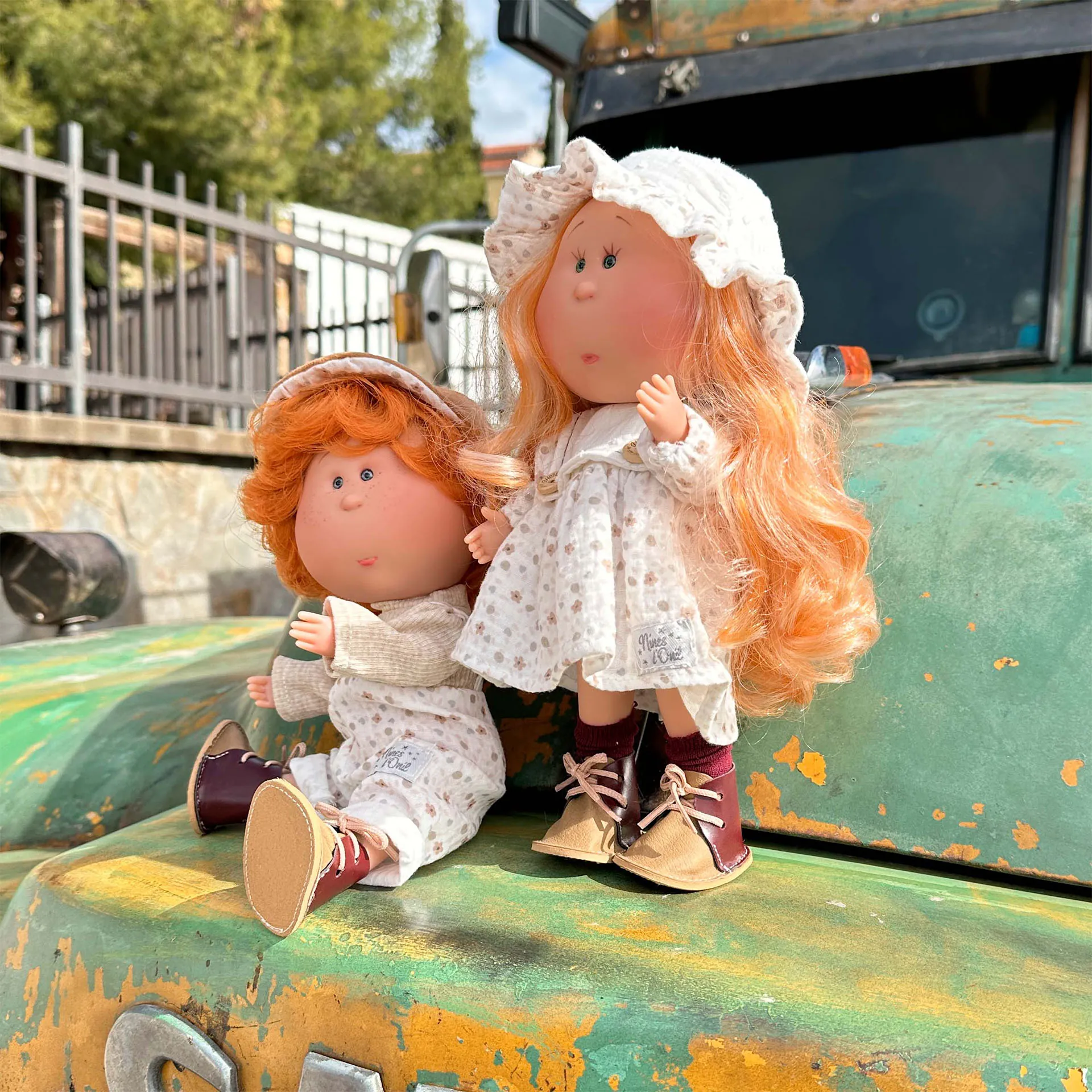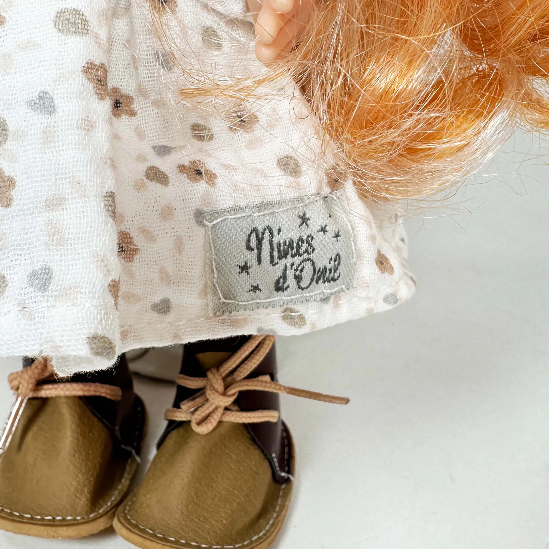 Papusa Nines D’Onil, Mia, cu parul portocaliu, cu palarie alba, cu articulatii, cu miros de vanilie, 30 cm
