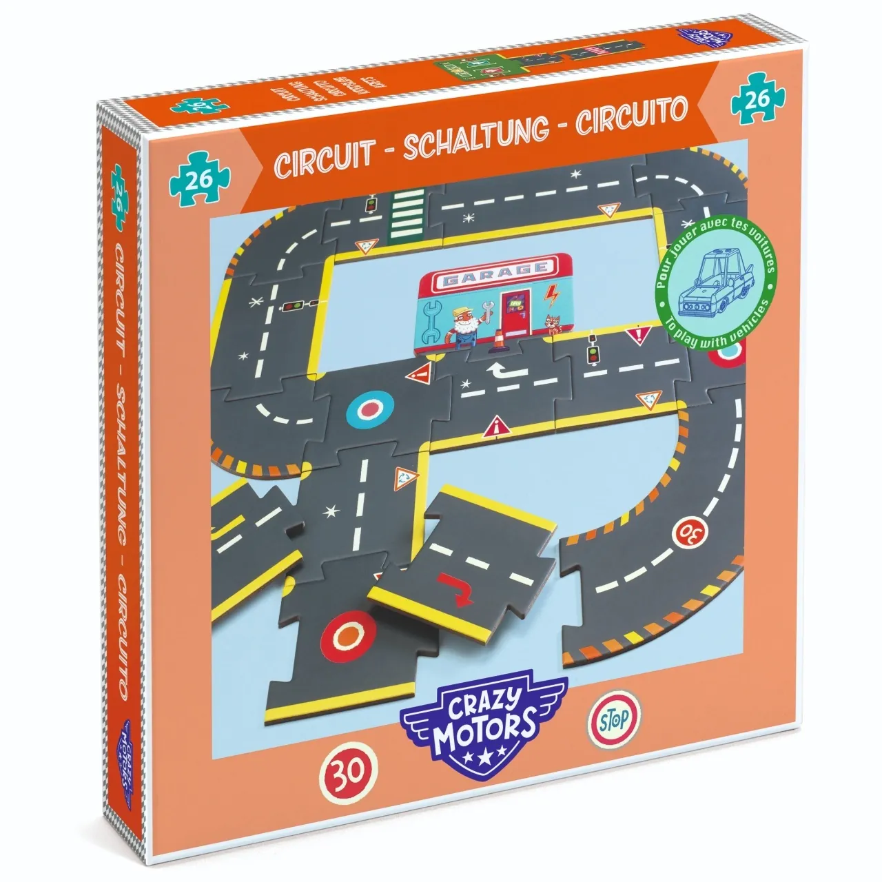 Un circuit uriaș alcătuit din 26 de piese de dimensiuni mari pentru a crea diferite trasee pe care să circule mașinuțele Crazy Motors. Fiecare piesă este ilustrată cu detalii captivante și se combină pentru a forma piste personalizate, pline de acțiune. Circuitul este compatibil cu alte puzzle-uri Crazy Motors și poate fi extins cu ușurință. Perfect pentru micii pasionați de mașini, acest set stimulează imaginația, dezvoltă abilitățile motrice și oferă ore întregi de activitate și distracție!