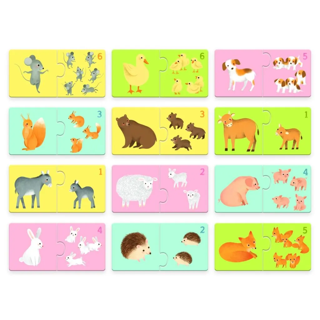 O activitate pentru micuții exploratori! Puzzle educativ cu animale pentru o introducere simplă și plină de candoare în jocurile de asociere pentru copiii de la 2 ani în sus. Copiii trebuie să potrivească fiecare animal adult cu puiul său – un mod distractiv de a învăța despre lumea animalelor.