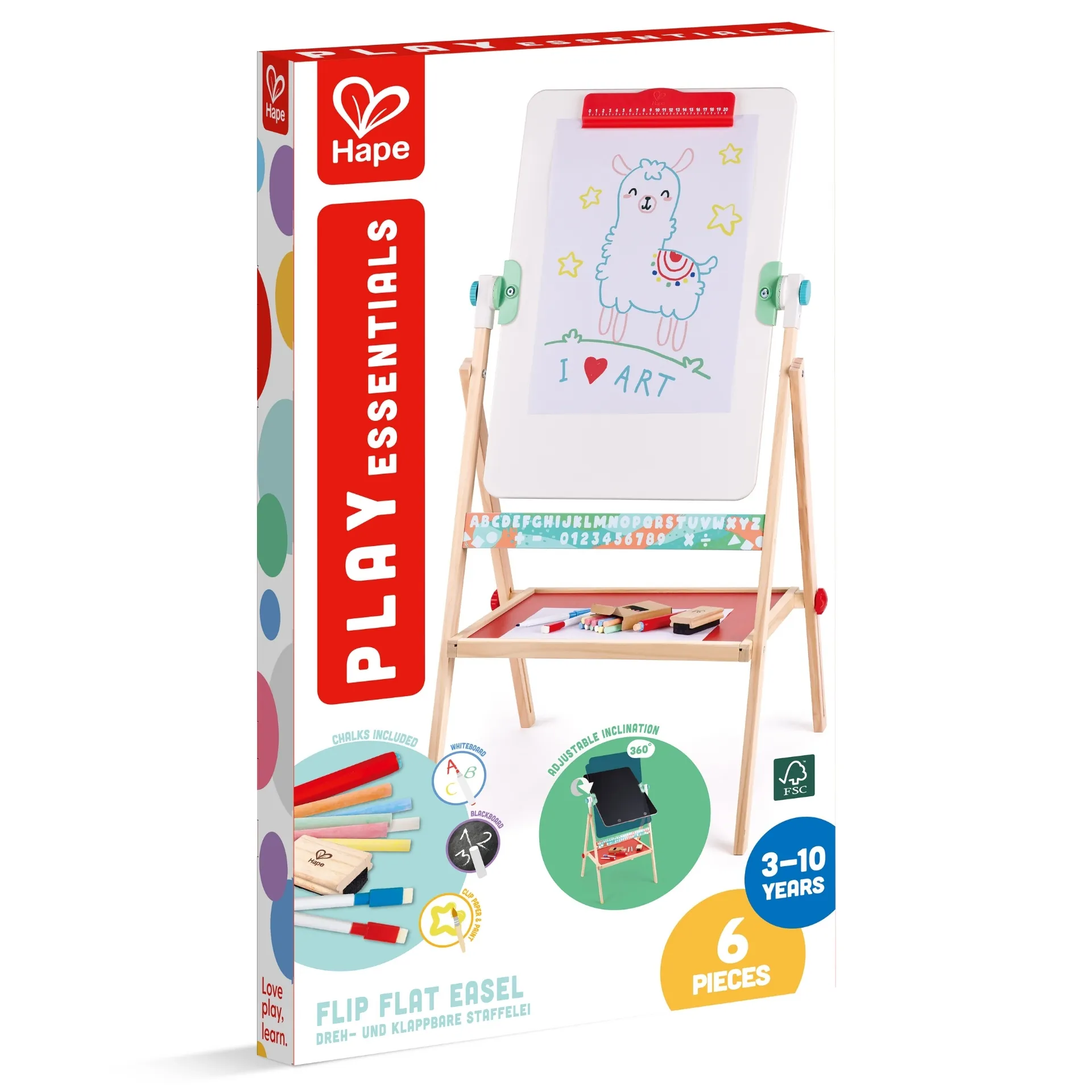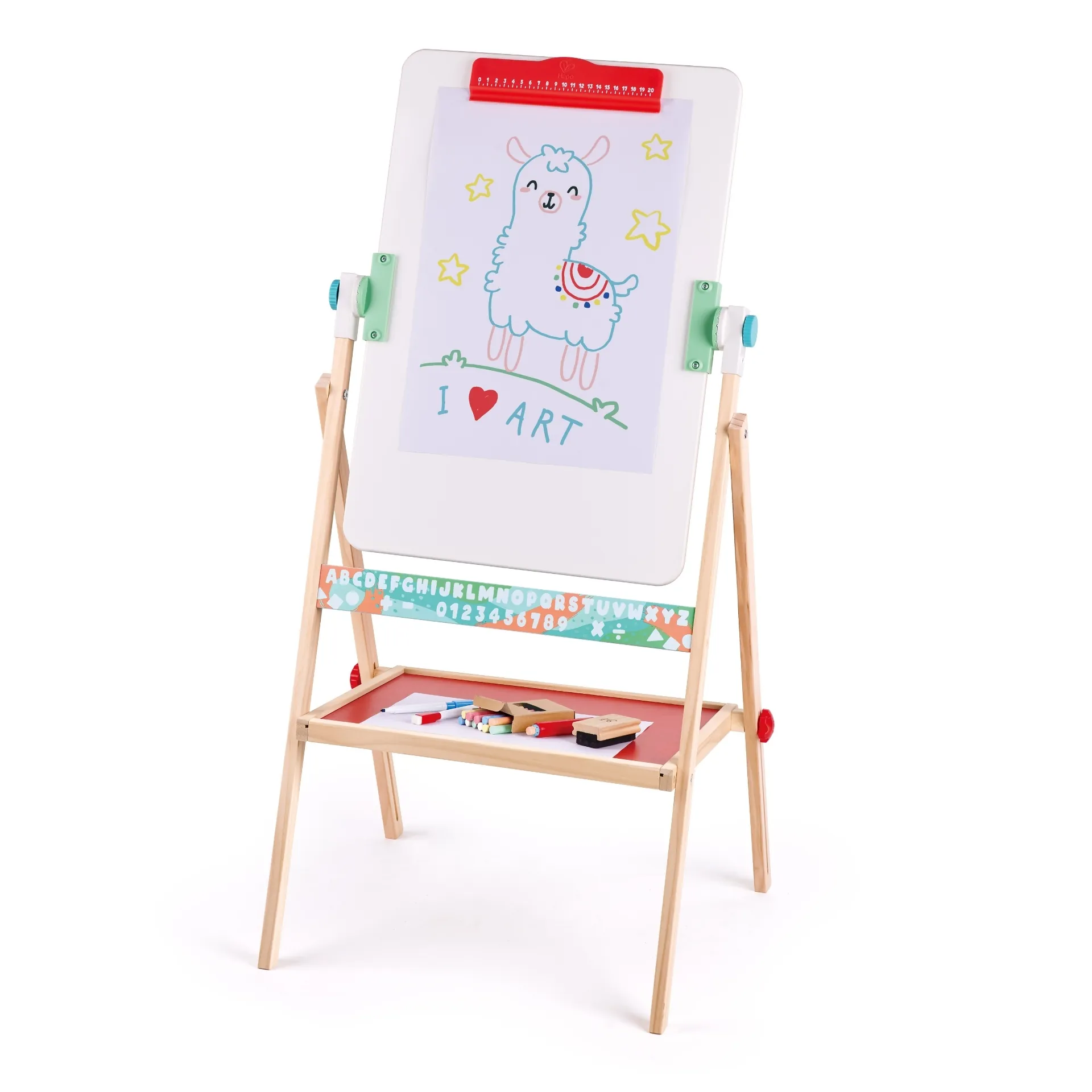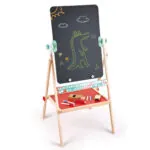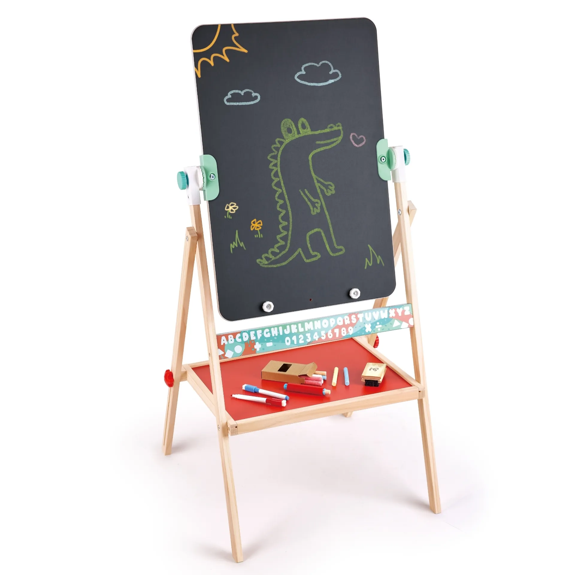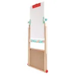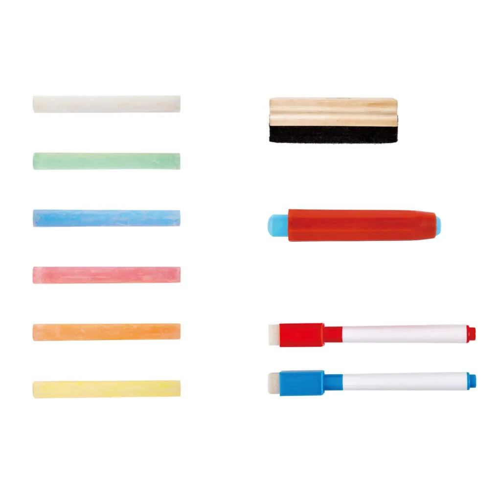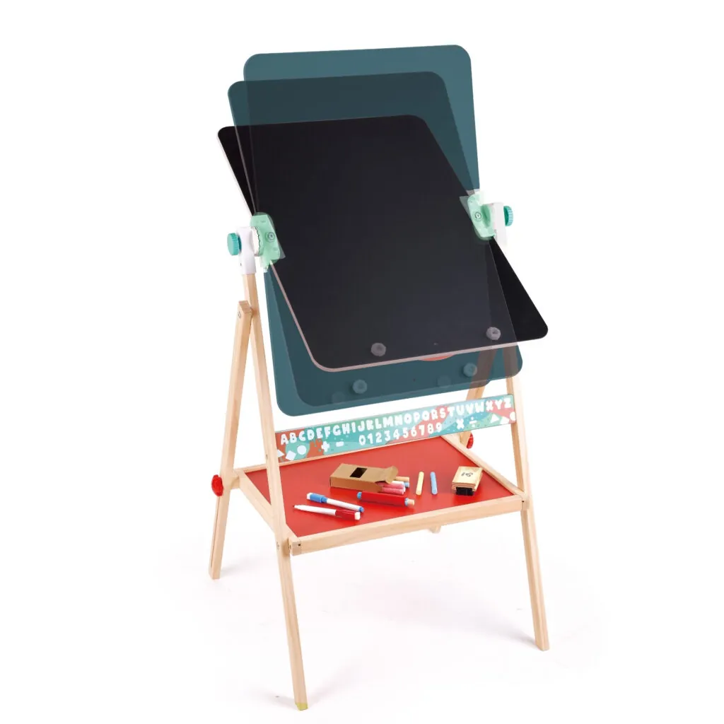Sevalet independent cu tabla neagra si tabla alba. Include 12 crete de culori diferite, doua markere, un suport pentru creta si o tabla de cauciuc. Dispune de un suport pentru hartie de orice dimensiune, care poate fi folosit si ca rigla. Sevaletul are o tava pentru accesorii. Picioarele sevaletului se pliaza intr-un gest, facilitand depozitarea, deoarece este super subtire. Prezinta grafica cu litere si cifre de-a lungul partii inferioare a sevaletului. Excelent pentru dezvoltarea autoexprimarii, creativitatii si imaginatiei.
